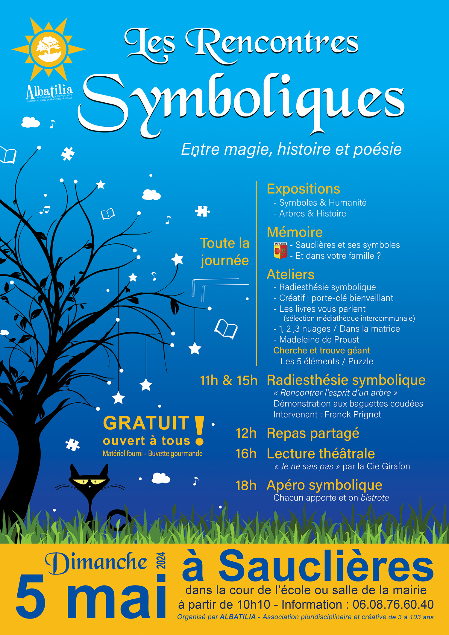 Le milieu rural est un territoire riche d'une très grande diversité humaine, animale et écologique. Albatilia tient à valoriser ces écosystèmes en proposant des ateliers et des événements basés sur l'épanouissement de l'être humain et le respect de la nature. Ces projets ont pour objectifs de créer des liens intergénérationnels et de mettre en valeur la richesse de ces milieux. Grâce à l'appui de la mairie et au soutien de plusieurs personnes, nous pouvons organiser et mettre en place divers événements au sein de la commune de Sauclières. Voici quelques affiches et visuels de ces événements.