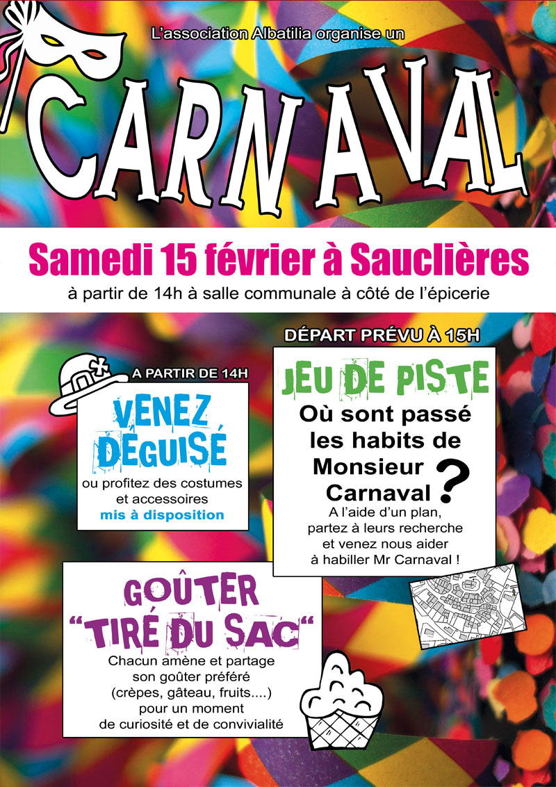 Tout le monde est invité à venir déguisé, des costumes et accessoires sont mis à disposition pour ceux qui n'auraient pas de déguisement. A partir de 15h, un jeu de piste est organisé "Où sont passés les habits de Monsieur Carnaval ? A l'aide d'un plan, nous partons à leurs recherche et nous habillons ensuite Monsieur Carnaval " Un goûter "tiré du sac" est prévu pour terminer l'après-midi, chacun amène et partage son goûter préféré pour un moment de curiosité et de convivialité.